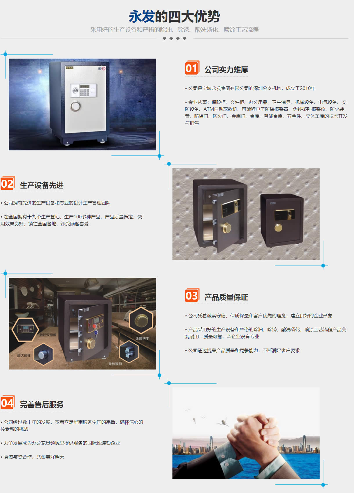 深圳永發(fā)安防產品有限公司 深圳永發(fā)安防產品有限公司,是寧波永發(fā)集團有限公司的深圳分支機構,成立于2010年,專業(yè)從事:保險柜、文件柜、辦公用品、衛(wèi)生潔具、機械設備、電氣設備、安防設備、ATM自動取款機、可編程電子防盜報警器、偽鈔鑒別報警儀、防火裝置、防盜門、防火門、金庫門、金庫、智能金庫、五金件、立體車庫的技術開發(fā)與銷售。
